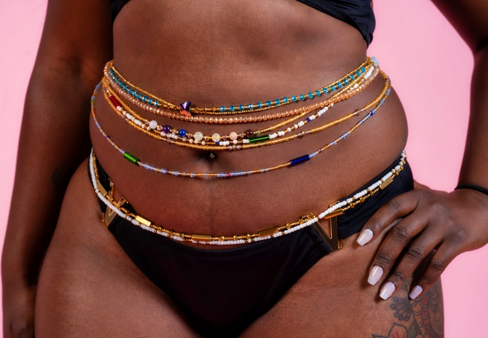 Traditionally African women wore waist beads along the panty line under the clothes. The beads served physical and spiritual functions in their communities.
